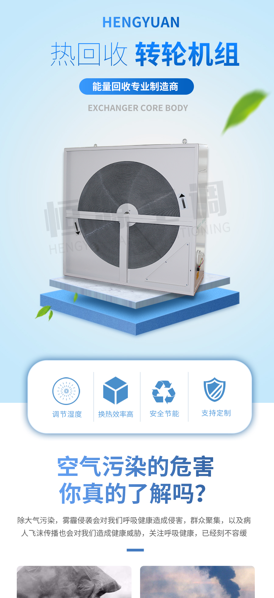 熱回收轉(zhuǎn)輪機組工作原理:以冬季為例,室內(nèi)的回風(fēng)通過熱交換器的上半部分,排出到室外。此時,外氣中所包含的大部分熱量和濕氣,聚集在轉(zhuǎn)輪中,排到室外的只有被污染了的空氣。另外,從熱交換器的下半部分引入的室外新風(fēng),通過轉(zhuǎn)輪時,獲取轉(zhuǎn)輪中所聚集的熱量和濕氣,被預(yù)熱和加濕,同樣夏天時有預(yù)冷、除濕作用,并連續(xù)不斷地向室內(nèi)供給新風(fēng)。也就是說,全熱回收轉(zhuǎn)輪是一種回收由于換氣時所損失能量的節(jié)能裝置。